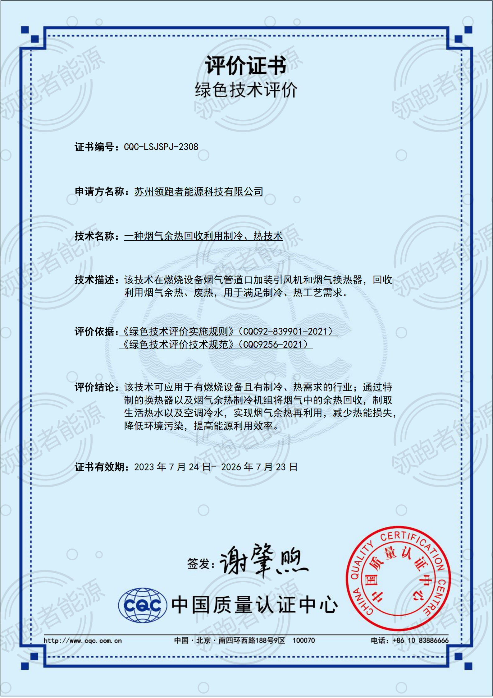 近日,蘇州領(lǐng)跑者能源科技有限公司榮獲由中國質(zhì)量認(rèn)證中心頒布的“一種煙氣余熱回收利用制冷、制熱技術(shù)”CQC綠色技術(shù)評(píng)價(jià)證書。CQC......